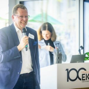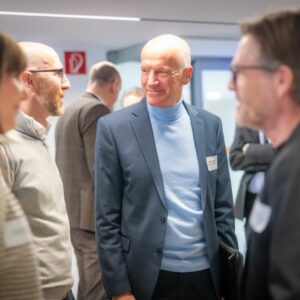 Als Nächstes hatte Martin Richrath das Wort, der als Kölner sehr froh sei, „am heutigen Rosenmontag einen Termin in Bielefeld zu haben“, wie er scherzhaft zu Protokoll gab. Anschließend stellte er in Form eines unterhaltsamen Imagefilms kurz und knackig das gastgebende Unternehmen vor, das 2025 sein 100-jähriges Bestehen feierte. Seine Botschaft: Menschen arbeiten für Menschen mit Menschen. Eine Haltung, die gut zum Selbstverständnis des Marketing Clubs passt.