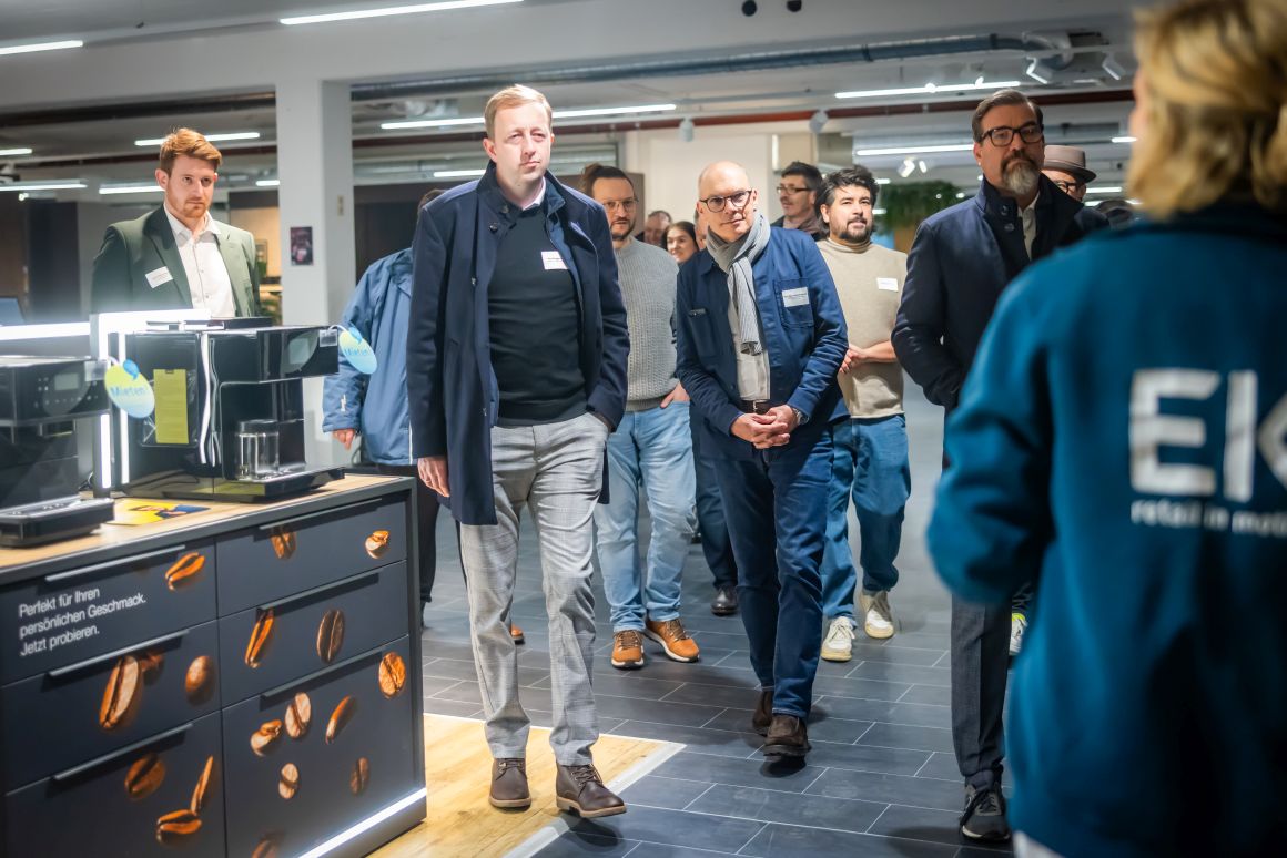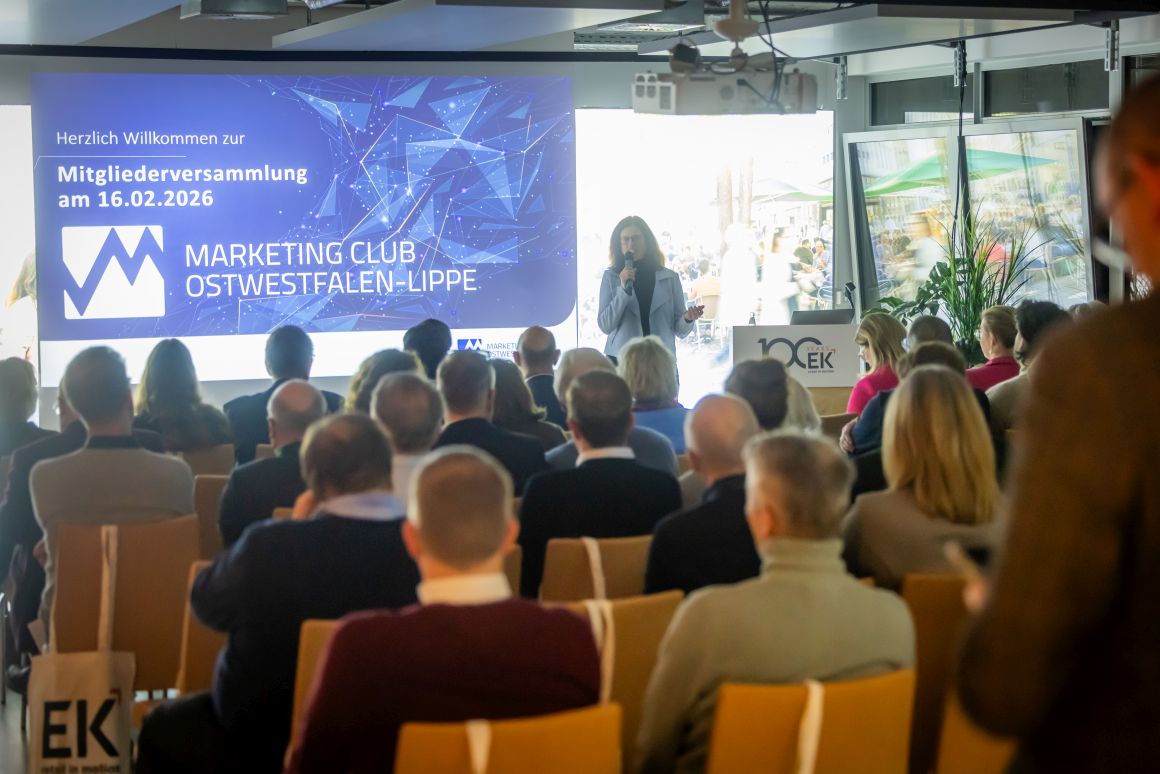(Bielefeld, 16. Februar 2026) Der Marketing Club Ostwestfalen-Lippe war zu Gast bei EK Retail in Bielefeld-Oldentrup. Die alljährliche Mitgliederversammlung stand auf dem Programm. Aber zuvor gaben Daniel Kullmann, Head of Corporate Marketing and Communications, und Melina Wosnitza, Senior Corporate Communications & Events Manager bei der EK – beide übrigens schon mehr als 20 Jahre im Unternehmen – im Rahmen einer Führung einen exklusiven Einblick, was den genossenschaftlich organisierten Mehrbranchenverbund so besonders macht.