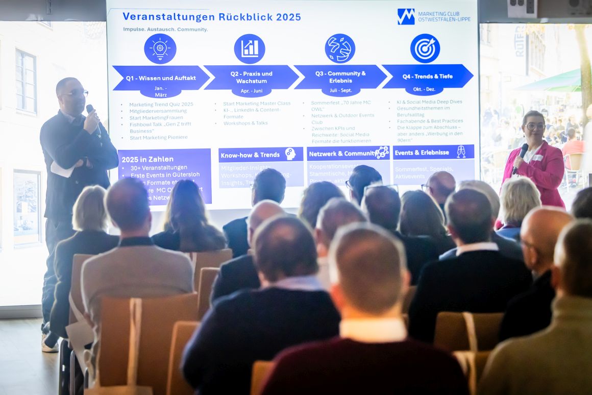„2026 setzen wir als Club bewusst auf Qualität und freuen uns darauf Formate auch als Ergänzung in Gütersloh und Paderborn anzubieten“, so Kristina Herrmann, die auch erfolgreich den Stammtisch der MarketingFrauen auf die Beine gestellt hat, der ein Mal im Quartal stattfindet. Bereits gestartet ist das neue Veranstaltungsjahr mit dem Marketingquiz. Weitere Highlights wie die zweite „Fuckup Night“ sowie zahlreiche Praxisformate sind in Planung. Ziel bleibt es, aktuelle Marketingthemen mit echtem Mehrwert zu verbinden. Weitere Infos gibt es bereits auf der Website.
