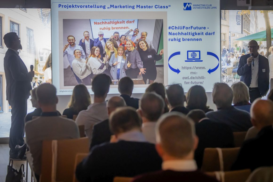 Die Marketing Master Class, die 2024 erstmals auf Initiative des Beirats durchgeführt wurde, dient der Nachwuchsförderung. „Wir haben das Konzept 2025 weiterentwickelt“, erklärte Beiratsmitglied Uwe Wollgramm, der zusammen mit Torsten Scholz die letztjährigen Absolventinnen mit viel Herzblut begleitete. Im vergangenen Jahr mussten Interessierte von ihrem Unternehmen nominiert werden und sich mit einem Motivationsschreiben für einen Platz in der Master Class bewerben. „Wir hatten nicht viele, aber dafür sehr gute Bewerbungen“, erinnerte sich Uwe Wollgramm. „Das hat viel Spaß gemacht, besonders gelungen war, dass am Ende eine Kampagne entwickelt wurde, die nun tatsächlich umgesetzt wird und zu unserem Marketing Club passt.“ „Wir könnten stolzer nicht sein“, ergänzte Torsten Scholz, der die von sechs berufserfahrenen jungen Frauen konzipierte Kampagne vorstellte. Der Startschuss von #ChiliForFuture – Nachhaltigkeit darf ruhig brennen“ fällt einen Tag nach der Mitgliederversammlung bei der Präsentation auf dem Deutschen Marketing Tag in Frankfurt. Vordergründig beißen Repräsentanten eines nominierten Unternehmens in eine Chili-Schote – in Anlehnung an die legendäre Ice Bucket Challenge –, sagen, was ihr Unternehmen in puncto Nachhaltigkeit unternimmt, filmen sich dabei und fordern ein weiteres Unternehmen auf, sich an der Challenge zu beteiligen. Hintergrund ist, dass viele Firmen sich in Anbetracht von Greenwashing nicht trauen, öffentlich zu kommunizieren, welche Nachhaltigkeitsmaßnahmen sie umsetzen oder ihre Nachhaltigkeitsberichte in der Schublade versauern. Über diese Beispiele sollen Unternehmen in den Austausch kommen, Vorbilder geschaffen werden und andere Firmen im besten Sinne zur Nachahmung inspiriert werden. Man darf gespannt sein, wie die Kampagne in der Realität funktioniert. Wer mitmachen möchte, findet weitere Infos unter www.mc-owl.de/chili-for-future/.
