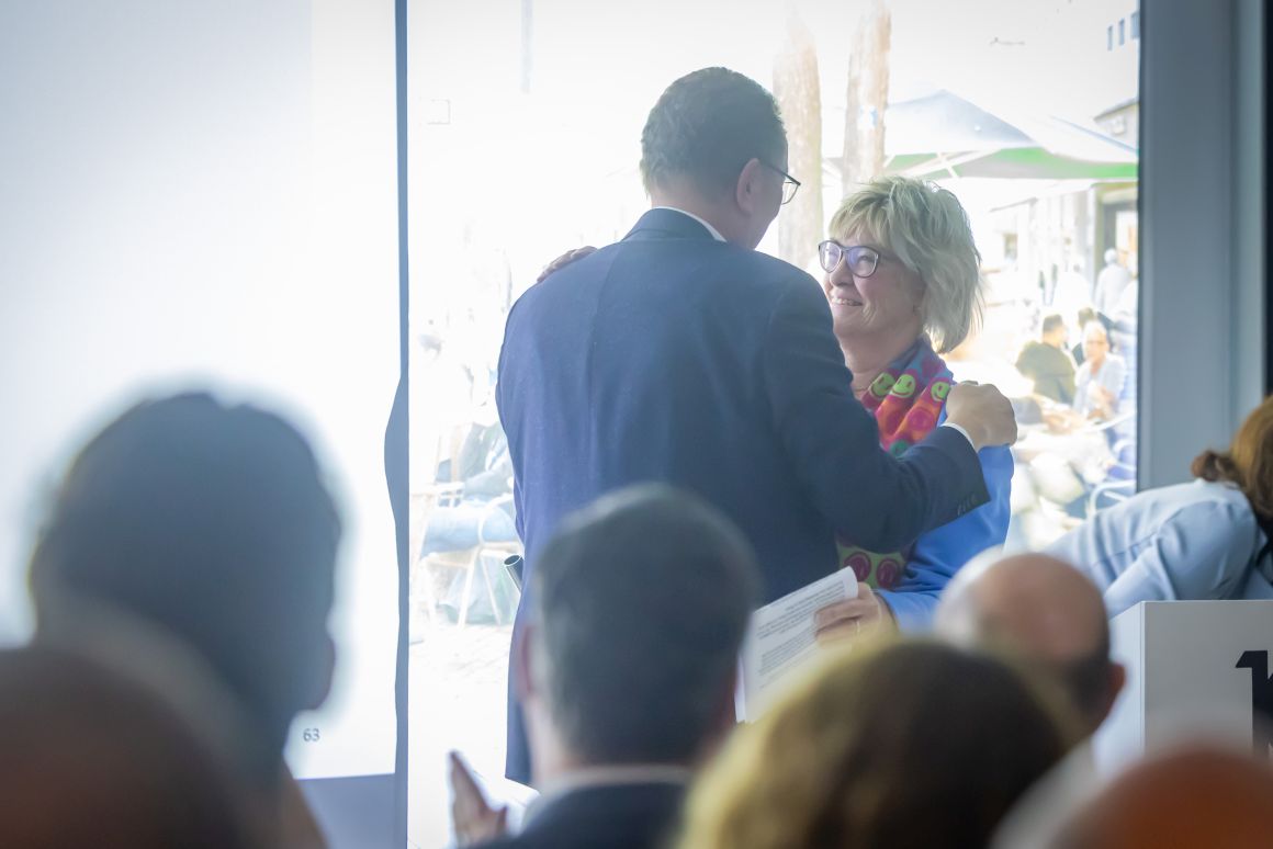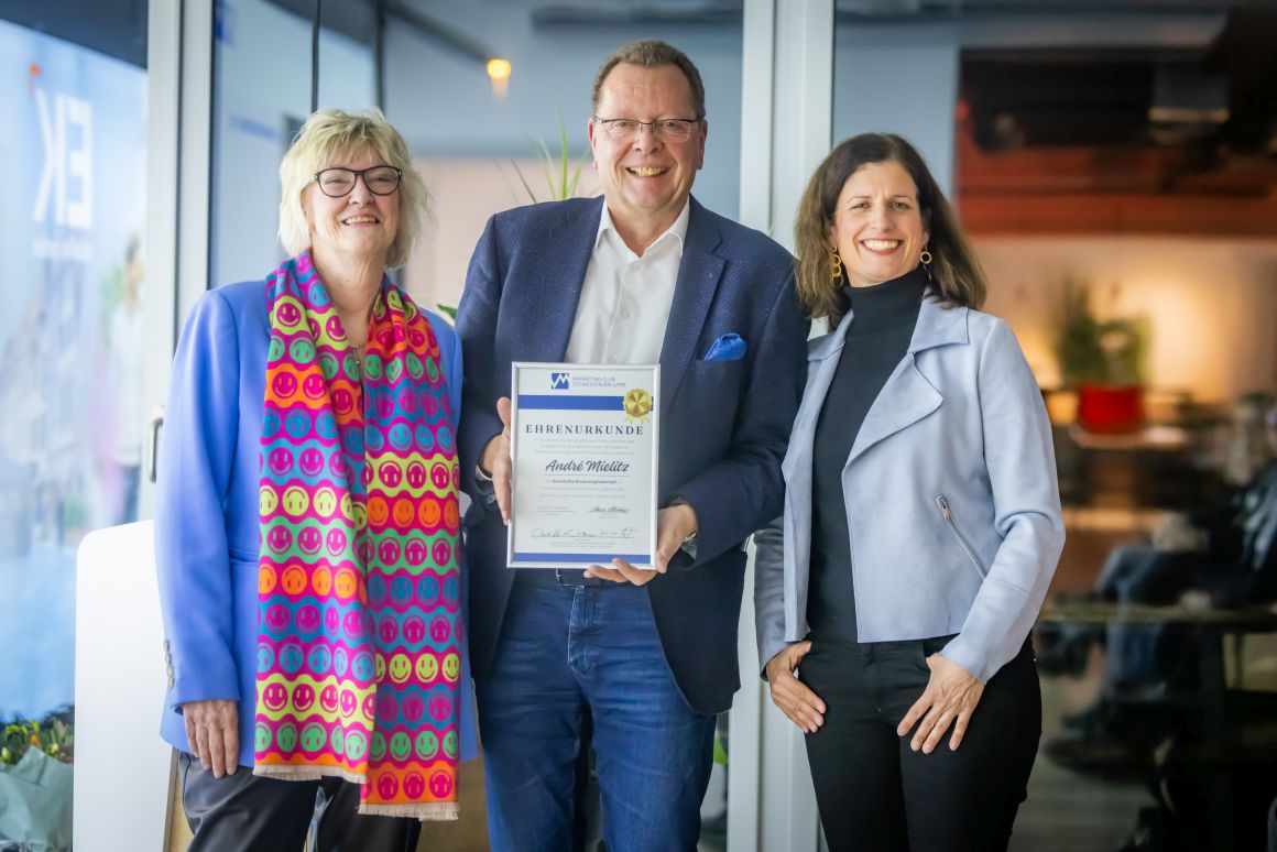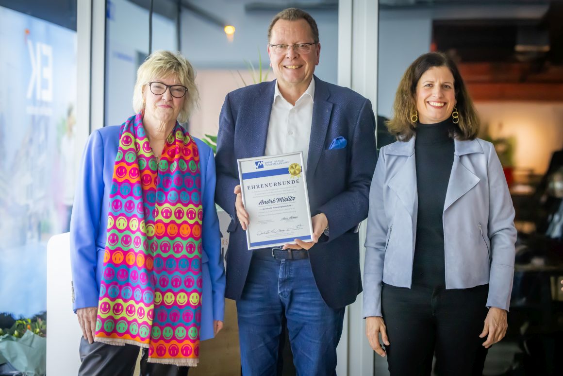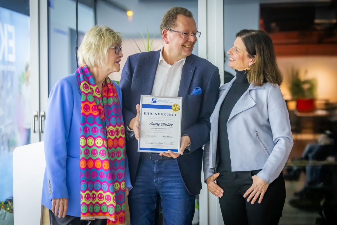 Ein besonders emotionaler Moment der Mitgliederversammlung war die Verabschiedung des langjährigen Geschäftsführers André Mielitz, der die Geschicke des Marketing Clubs 25 Jahre mit großem Engagement und persönlichem Einsatz geprägt hat. „Eine Leistung, auf die er zu Recht stolz sein kann“, wie die ehemalige MC-Präsidentin und langjährige Mitstreiterin Susanne Schäfer-Dieterle in ihrer Laudatio betonte. Über die vielen Jahre hinweg war André Mielitz nicht nur organisatorischer Anker im Hintergrund, sondern strategischer Impulsgeber, verlässlicher Ansprechpartner und wichtiger Netzwerker. Er initiierte neue Formen der Kommunikation – mit dem Club Report – und begleitete den Aufbau der Website. Erstmals gab es digitale Infos über den Club, seine Veranstaltungen und die Möglichkeit, sich anzumelden. In ihrem Rückblick auf 25 Jahre erinnerte Susanne Schäfer-Dieterle an die legendäre Feier zum 50. Jubiläum in der gerade eröffneten Dr. Oetker Welt, die fünf Präsident*innen in der Zeit, und dass der gebürtige Berliner seine berufliche Karriere 1981 zunächst in Gütersloh startete und 1999 die Agentur Artgerecht in Bielefeld gründete. Ab 2001 hatte auch die Geschäftsstelle des Marketing Clubs ihren Sitz in der Agentur. Die Freude am Austausch, an Menschen und daran, Verantwortung zu tragen – das macht André Mielitz aus. Dass der Club heute ein solch lebendiges Netzwerk ist, ist auch auf sein unermüdliches Engagement zurückzuführen. Sichtbar ergriffen, dankte er der Laudatorin: „Das hätte niemand besser machen können als du, Susanne.“ Abschließend übergab er den Staffelstab an Daniela Köller, verbunden mit den besten Wünschen.